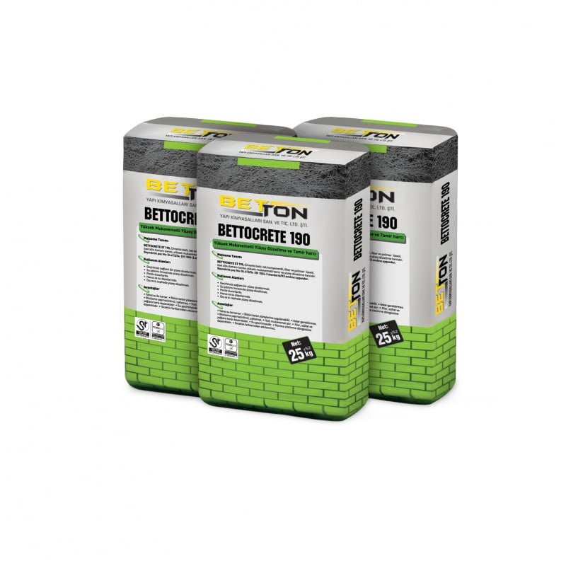 BETTOCRETE 190,çimento esaslı,polimer takviyeli,özel ve silis dumanı içeren , yüksek mukavemetli tamir ve yüzey düzeltme harcıdır.
